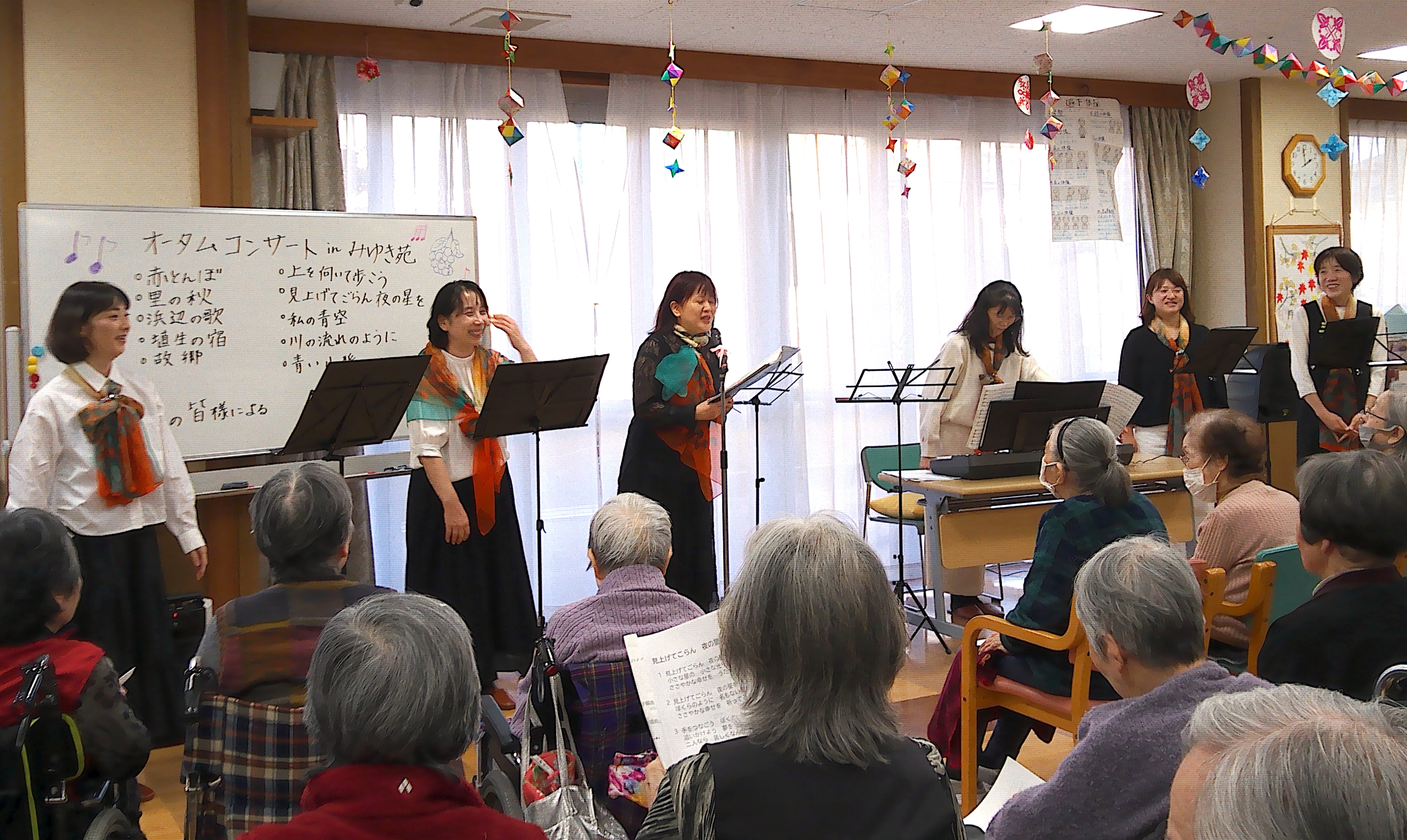 オータムコンサート 「オータムコンサート」 特養とデイの合同イベント、オータムコンサートを開催しました。 「ベリーベリーブルーベリー(VVBB)」の方をお招きして、秋にピッタリな曲を歌っていただきました。 利用者の皆様もVVBBの方が奏でる美しい歌声にうっとりと聞き入り、堪能していました。