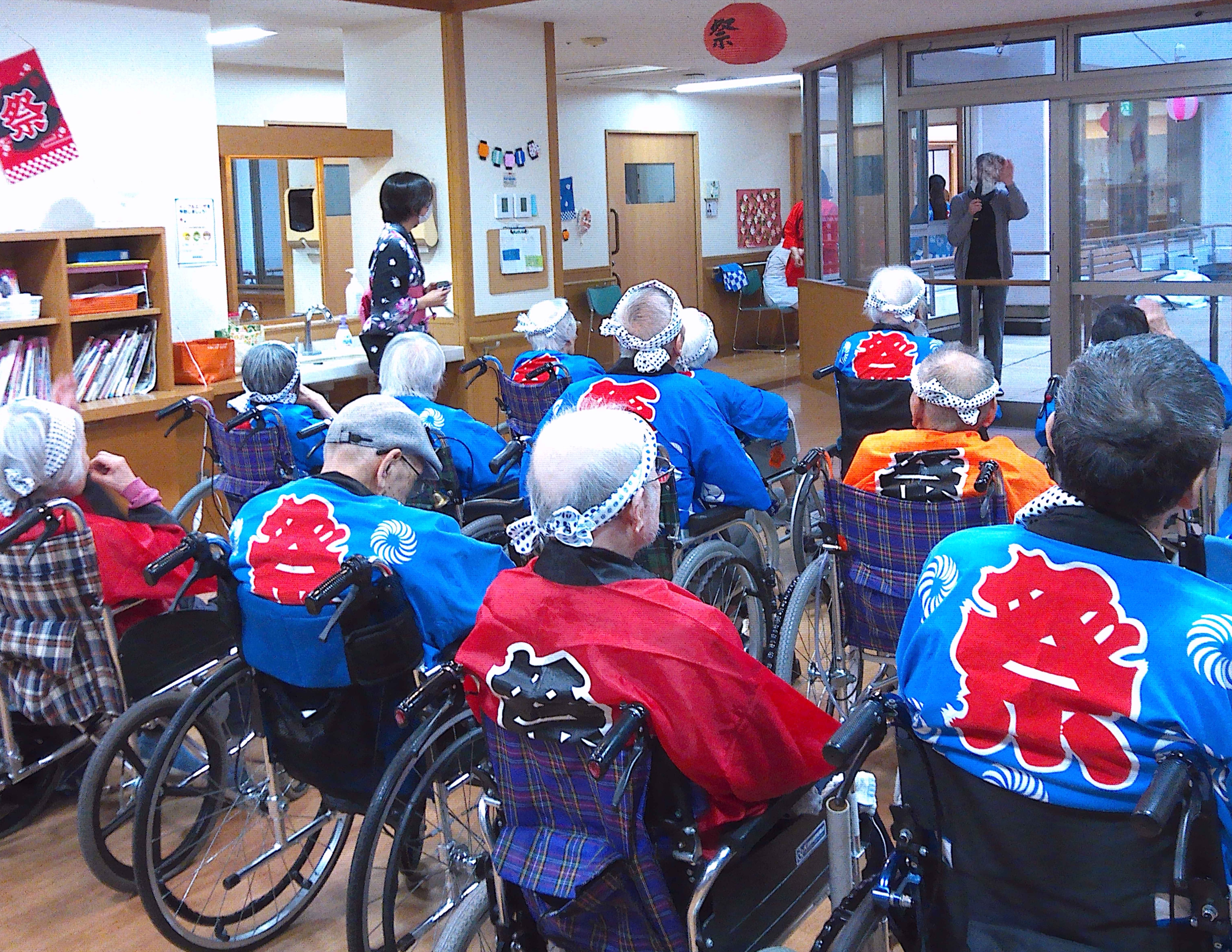 秋祭り 「みゆき苑秋祭り」 秋祭りを開催しました。 浴衣や法被を着て、お祭りらしくわたあめを食べたり射的をしたり、皆様楽しんでおられました。 途中で雨が降り中庭から撤退するというアクシデントもありましたが、概ねつつがなく終えることが出来ました。